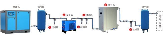 氣源、輸送管網(wǎng)和用氣末端設(shè)備三大部分組成了工廠完整的壓縮空氣系統(tǒng)。其中,氣源一般為空壓站,內(nèi)含空壓機、干燥機、儲氣罐和凈化過濾裝置(除油、除塵等)。
