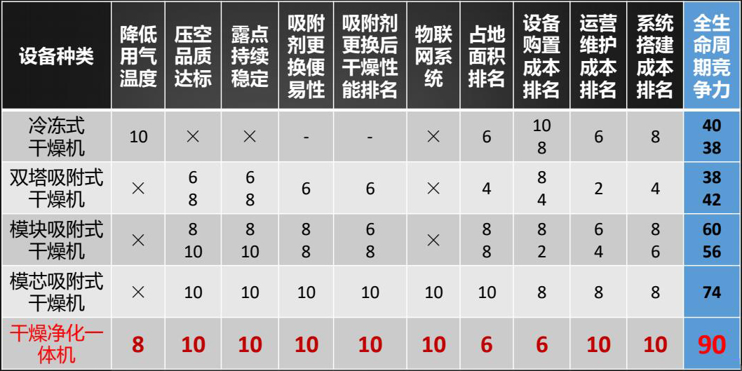 冷凍式干燥機(jī)標(biāo)稱壓力露點(diǎn)為:3~10℃,但受環(huán)境溫度變化和工況的變化影響很大,通常在10~25℃,導(dǎo)致用氣端產(chǎn)生液態(tài)水,會(huì)嚴(yán)重影響正常的安全生產(chǎn)和產(chǎn)品品質(zhì),冷干機(jī)雖然綜合成本較低,但是使用效果和使用壽命并不理想,其冷凝器和蒸發(fā)器故障較多,維修成本高。