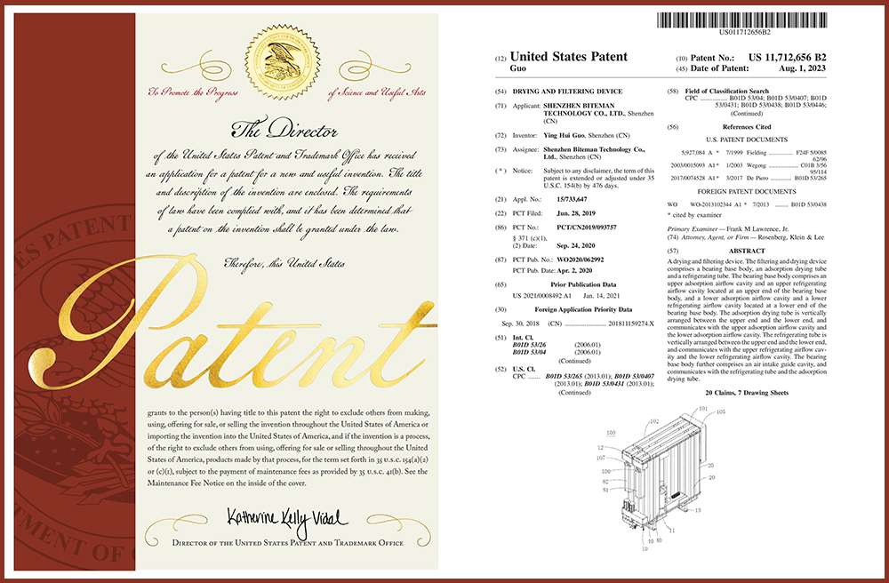 8月1日,深圳市貝騰科技有限公司又一核心技術(shù)“干燥過濾裝置”獲得美國專利局證書,標(biāo)志著貝騰科技在壓縮空氣干燥凈化技術(shù)創(chuàng)新及國際化知識產(chǎn)權(quán)布局方面取得又一重大突破!