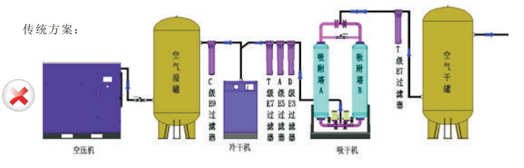 傳統(tǒng)方案(過濾器+冷干機+雙塔式吸干機)