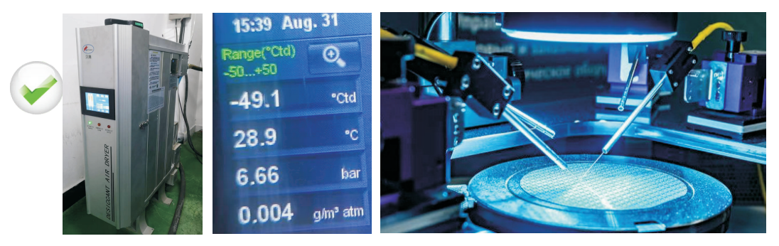 某半導體封裝封企業(yè),生產(chǎn)中應用了25萬美元的進口低溫探針臺,該設備要求壓縮空氣露點必須小于等于-60℃,原使用的后處理設備為“冷干機+微熱型雙塔吸干機”,露點很難穩(wěn)定,無法滿足低溫測試設備的用氣品質要求,給生產(chǎn)造成極大困擾。
