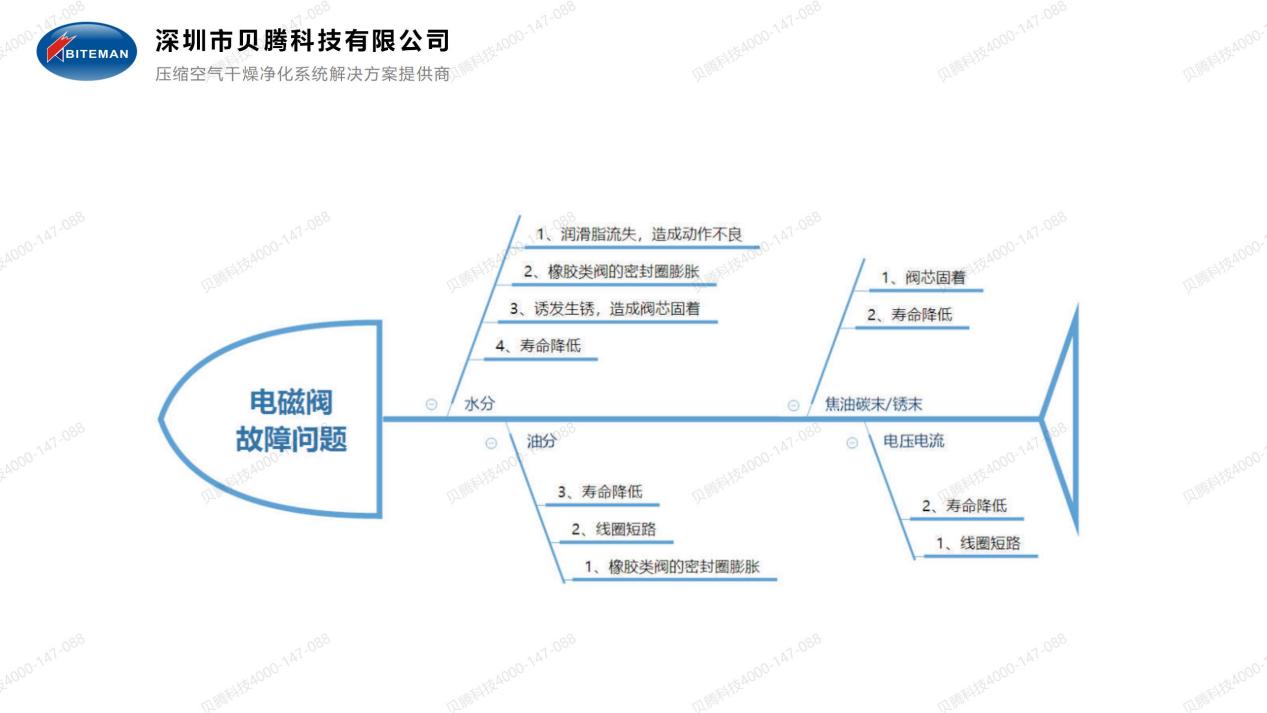 氣動(dòng)電磁閥是用來控制流體的自動(dòng)化基礎(chǔ)元件,具有反應(yīng)快,動(dòng)作更靈敏,調(diào)節(jié)控制方便等優(yōu)點(diǎn),廣泛應(yīng)用于自動(dòng)化領(lǐng)域。正常情況下,氣動(dòng)電磁閥壽命在5年以上(2000萬次切換以上),但是,由于壓縮空氣含水含油超標(biāo),導(dǎo)致壽命大幅下降,風(fēng)險(xiǎn)不可控,頻繁故障停機(jī),嚴(yán)重影響正常的安全生產(chǎn)。