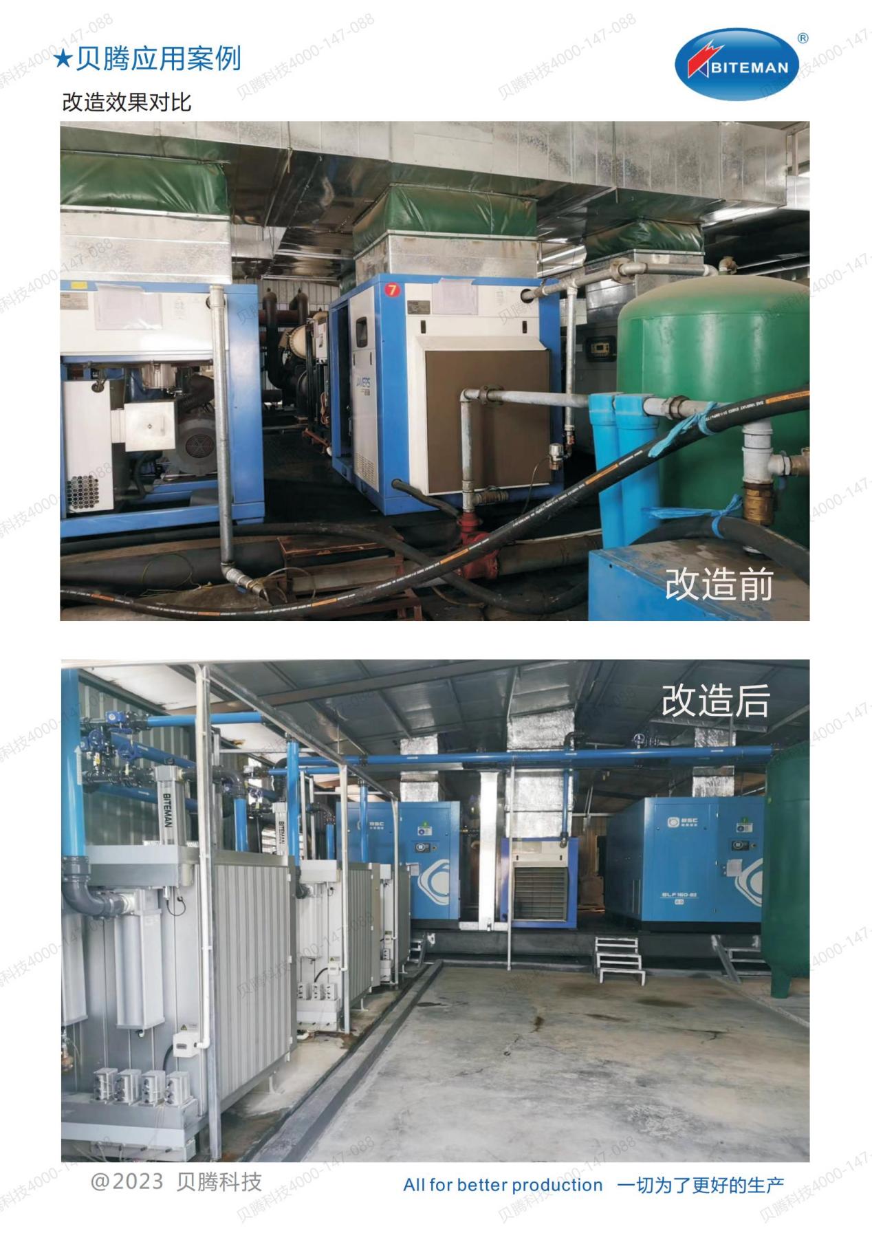 5. 貝騰解決方案:壓縮空氣干燥凈化設(shè)備選用國內(nèi)技術(shù)領(lǐng)先的貝騰第八代產(chǎn)品干燥凈化一體機(jī),徹底解決原空壓站壓縮空氣品質(zhì)嚴(yán)重不達(dá)標(biāo)、壓降大、能耗高等直接影響企業(yè)生產(chǎn)的痛點(diǎn)問題,大大提升生產(chǎn)工藝水平和產(chǎn)品良品率,增強(qiáng)企業(yè)的核心競爭力。