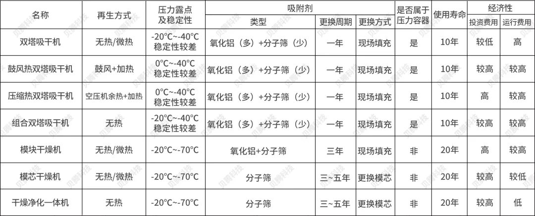 對(duì)壓縮空氣進(jìn)行干燥凈化是工業(yè)企業(yè)節(jié)約成本和保障高效安全生產(chǎn)的根本,吸附干燥是目前制備極低露點(diǎn)壓縮空氣的主要技術(shù),吸附干燥機(jī)也因此而發(fā)展成壓縮空氣深度除水的最主要的裝備,主要吸附式干燥機(jī)種類如下表: