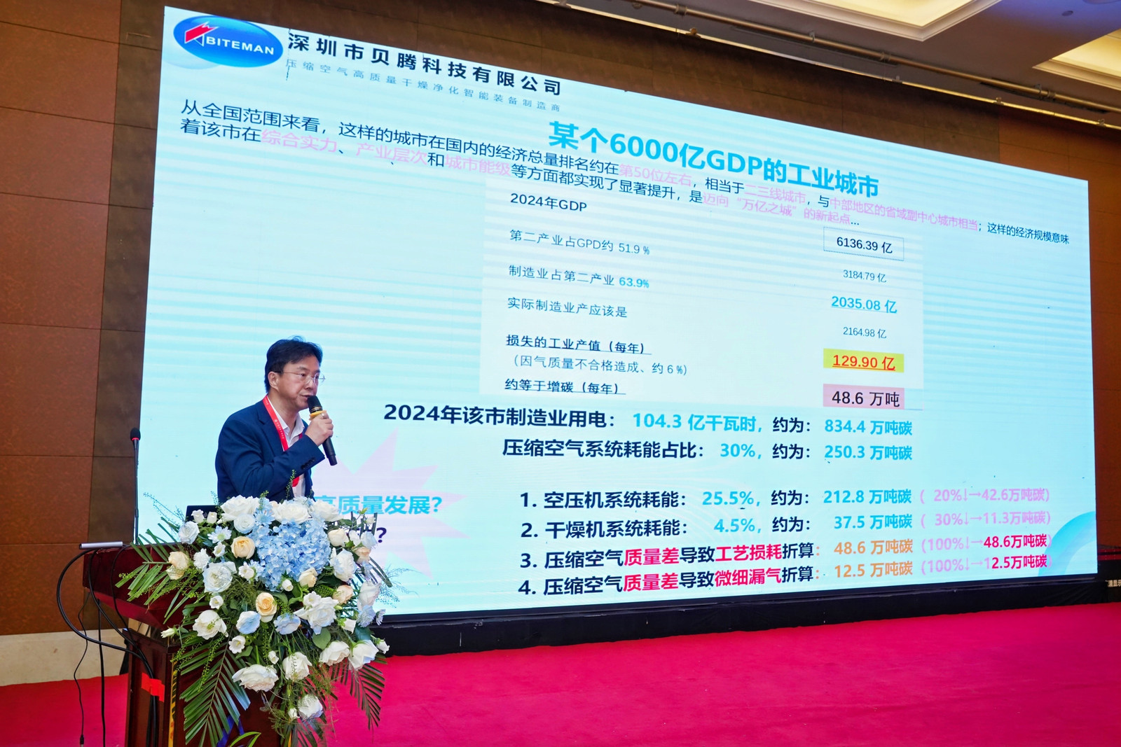 ? 在會議期間,深圳市貝騰科技有限公司新質(zhì)生產(chǎn)力政企合作總監(jiān)冷奇兵發(fā)表了以 “提升制造業(yè)壓縮空氣質(zhì)量、促進綠色高質(zhì)量發(fā)展、助力雙碳目標實現(xiàn)” 為主題的重要演講。冷奇兵總監(jiān)在演講中深入剖析了當前制造業(yè)壓縮空氣質(zhì)量的現(xiàn)狀以及對生產(chǎn)過程和環(huán)境的影響,并詳細闡述了貝騰科技在提升壓縮空氣質(zhì)量方面的先進技術和成功案例。他強調(diào),高質(zhì)量的壓縮空氣不僅是保障工業(yè)生產(chǎn)穩(wěn)定運行的關鍵,更是實現(xiàn)綠色高質(zhì)量發(fā)展、推動 “雙碳” 目標達成的重要支撐。貝騰科技多年來致力于壓縮空氣凈化設備的研發(fā)與創(chuàng)新,其先進的技術和產(chǎn)品能夠有效提升壓縮空氣質(zhì)量,降低能耗,為企業(yè)的節(jié)能減排和綠色發(fā)展提供有力保障。?